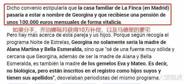 凭据合同,如果C罗和乔妹仳离,乔治娜每个月不错拿到10万欧元的毕生固定“工资”,另外还有总裁位于马德里的一处占地总面积达到4000平米、诞生面积足有1000平你的豪宅,也会被划到乔妹名下。